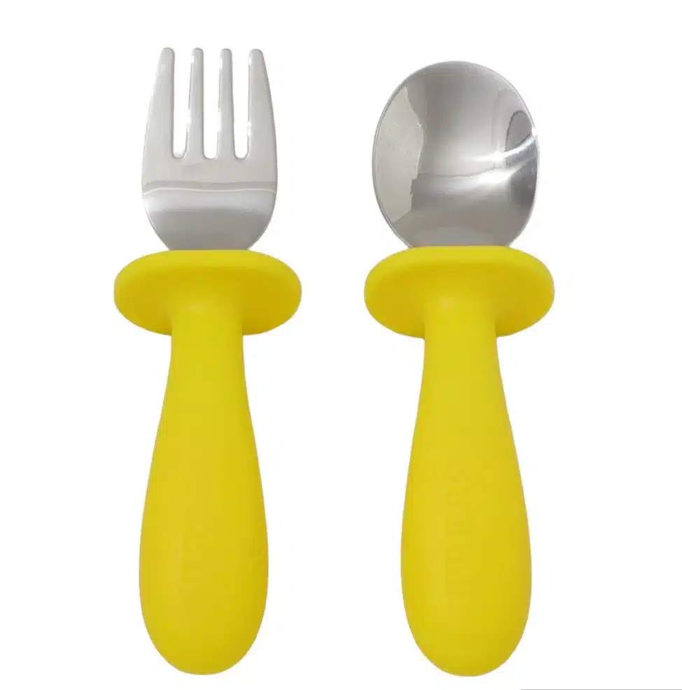 Tress Tableware Kids The Spoon & Fork Smile Yellow. Material: 60% silicone / 40% stainless steel. Measurement: length 13cm.